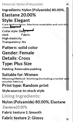 - Lining Composition: 80.00% Polyamide (Nylon), 20.00% Elastane (Spandex)
