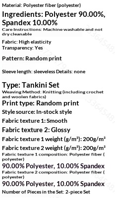 Composition: Polyester 90.0%, Spandex 10.0%Care Instructions: Machine washable, not dry-cleanableTransparency: YesPattern: Random printStretch: NoneStyle: Tailless suitProduct Type: NoneProduction Method: Knitting (including weaving), heat-rot fabricPattern Type: Random printPrint Category: Machine printingFabric Finish: SmoothFabric Finish: ShinyFabric Finish (Weight): 200g/㎡Fabric Finish (Weight): 200g/㎡Fabric Finish (Composition): Polyester (polyethylene terephthalate) 90.0%, Spandex 10.0%Fabric Finish (Composition): Polyester (polyethylene terephthalate) 90.0%, Spandex 10.0%Composition: 2 pieces